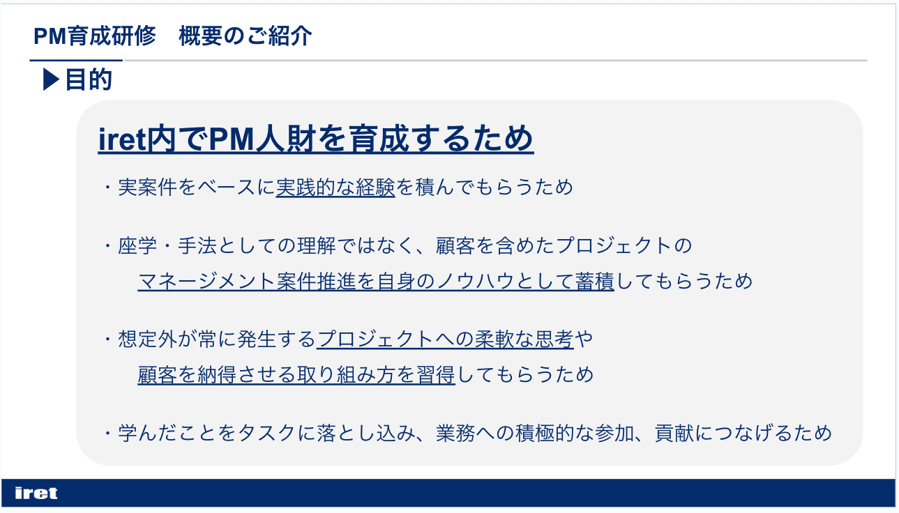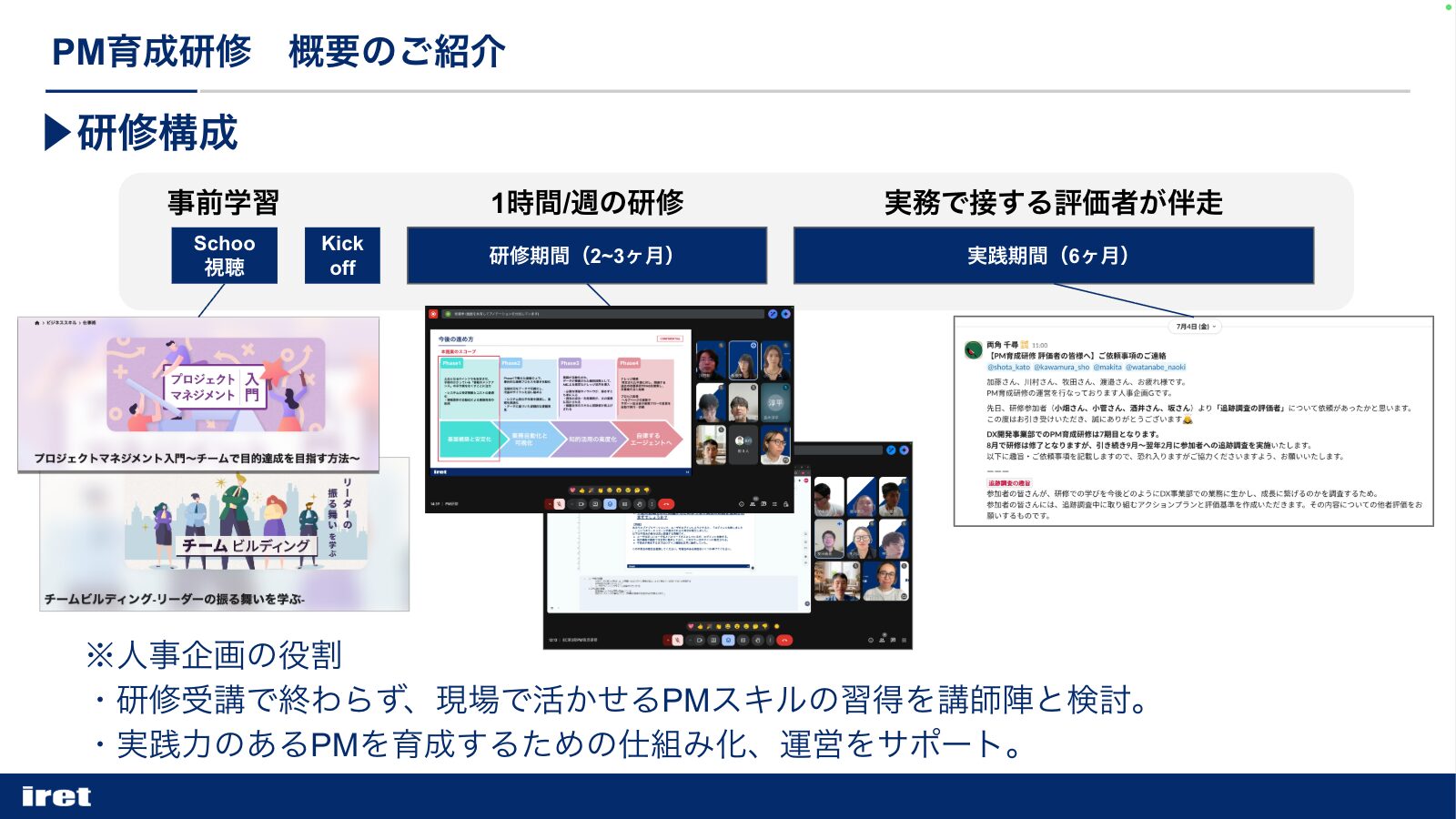 発表会冒頭では、運営サポートを担った人事企画メンバーから、PM育成研修の目的と実施方法を紹介しました。