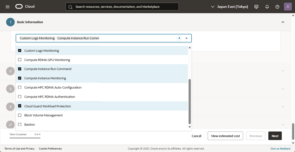 - 以下は、インスタンス作成時の「Oracle Cloud Agent」の設定画面です。デフォルトで、以下のプラグインが選択されています。