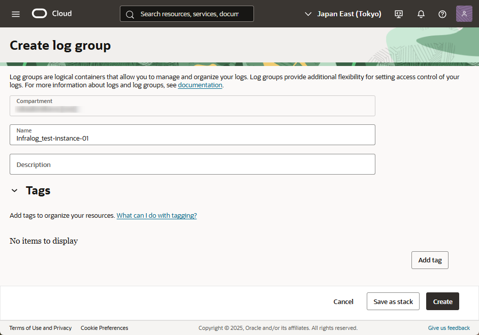 - 「Create log group」を選択します。