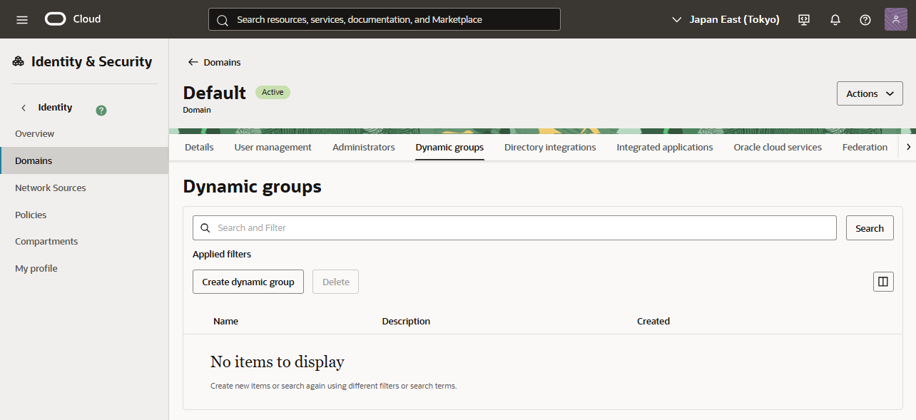 - OCIの管理コンソールにて、左ナビゲーションから「Identity & Security」→「Domains」を選択します。Default のDomain を選択します。