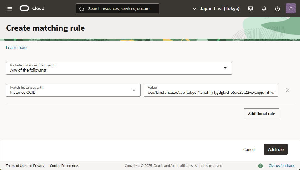 - 「Include instances that match」に「Any of the following」を選択、「Configuration name」に「Match instances with」に「Instance OCID」を選択、「Value」にインスタンスのOCID を貼り付けます。「Add rule」を選択します。