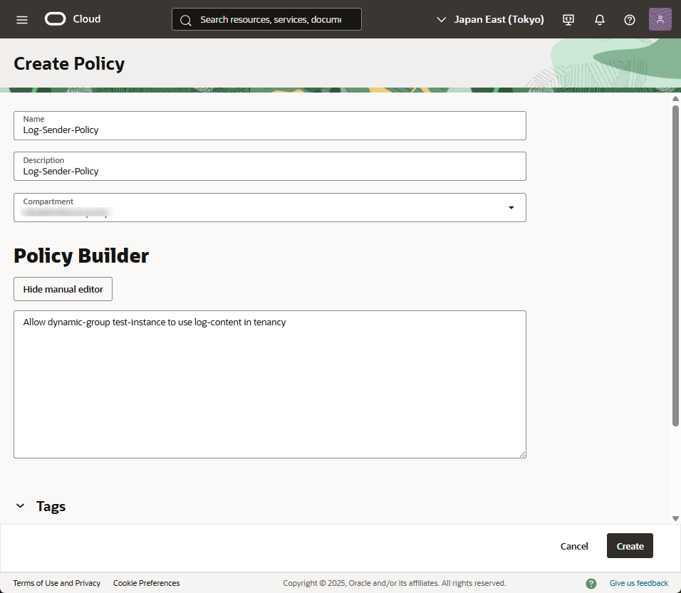 - Allow dynamic-group [dynamic group名] to use log-content in tenancy