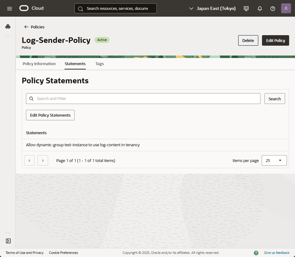 - ポリシーのStatement に以下を指定します。dynamic group名には、先ほど作成したdynamic groupの名前を指定します。
