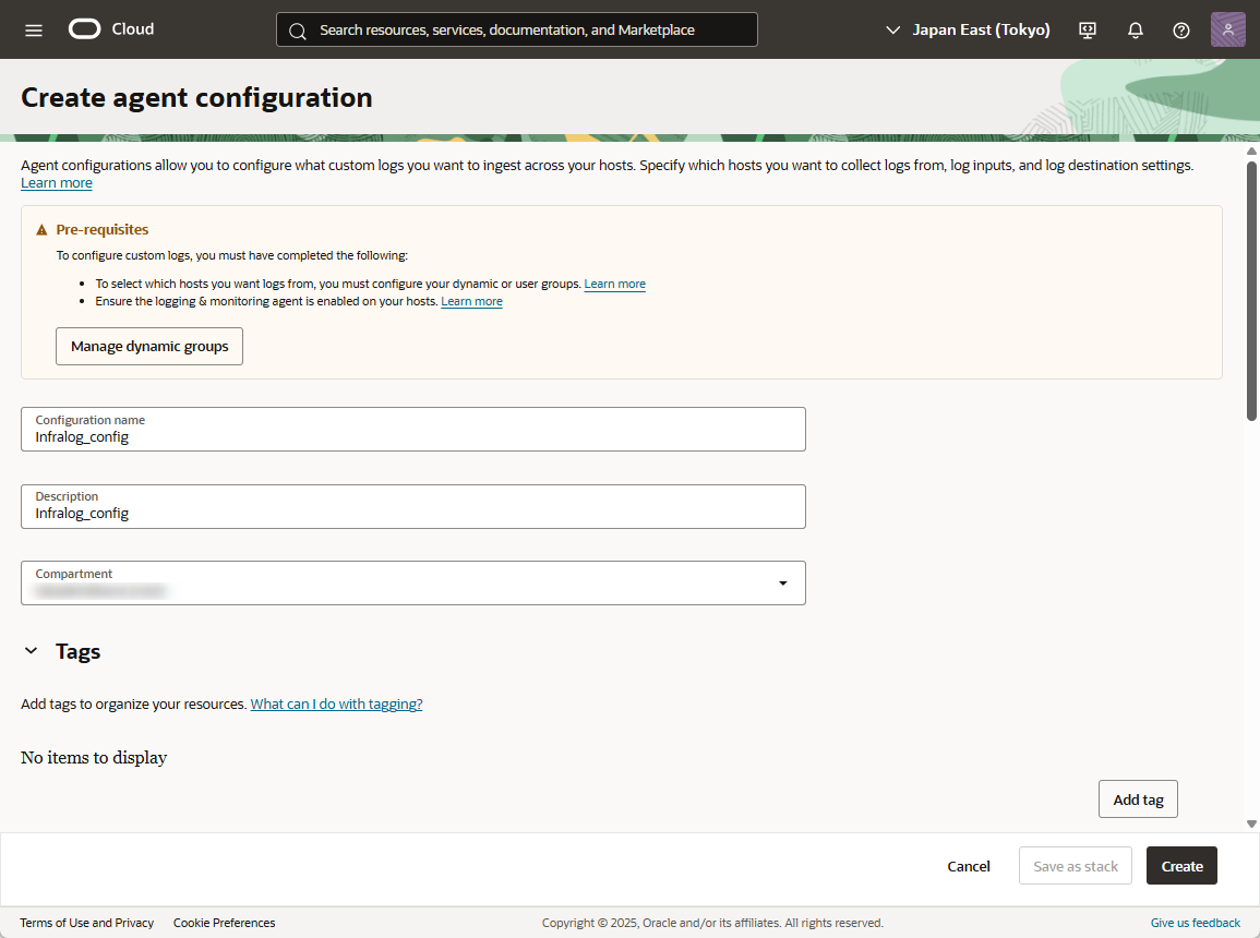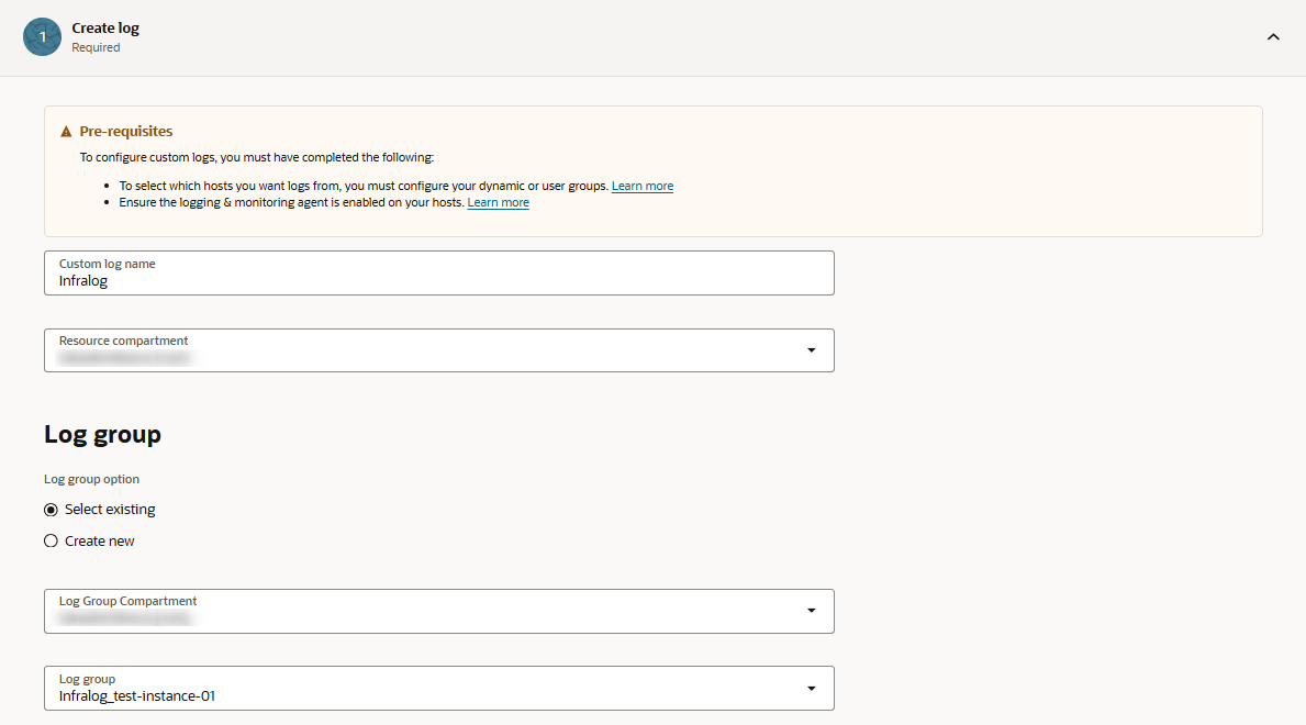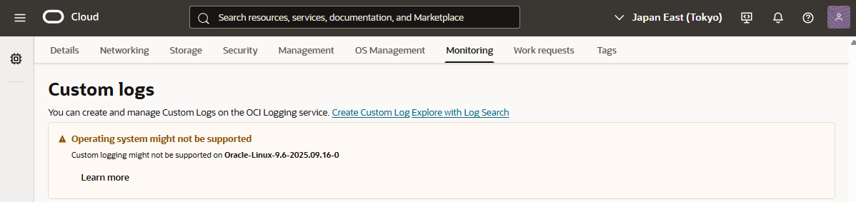 - 今回の検証は、インスタンスのOS にOracle Linux 8 を使用しています。当初、Oracle Linux 9 を試しましたが、インスタンス起動後、OCI コンソールに「Operating system might not be supported」と表示されたため「Custom Logs Monitoring」がサポートされない可能性を考え、Oracle Linux 8 へ変更しました。なお、Oracle Linux 9 のサポート有無の追加調査は行っていません。