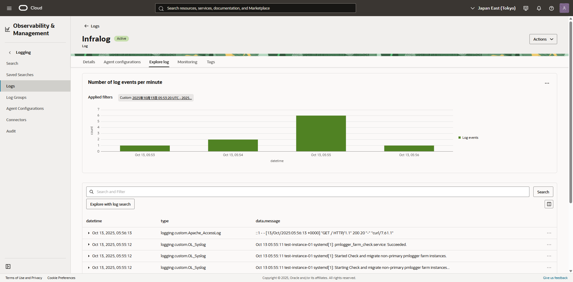 - インスタンス(Oracle Linux 8) にssh でログインし、テスト環境を準備します。今回の検証には、Oracle Linux のシステムログ、Apache のアクセスログ、エラーログを使用します。