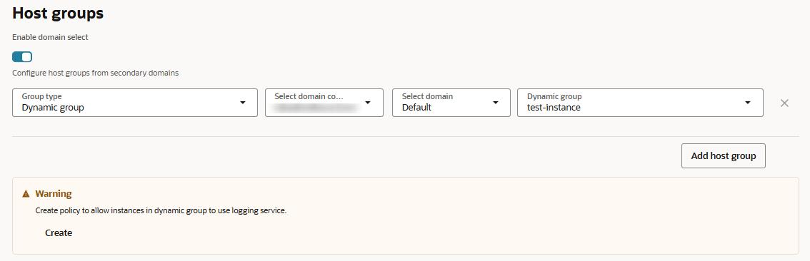 - Host groups の「Group type」に「Dynamic group」を指定、「Dynamic group」にIAMポリシーの設定で作成したdynamic group を選択します。以下のようなWarning が出力されますが、問題ありません。
