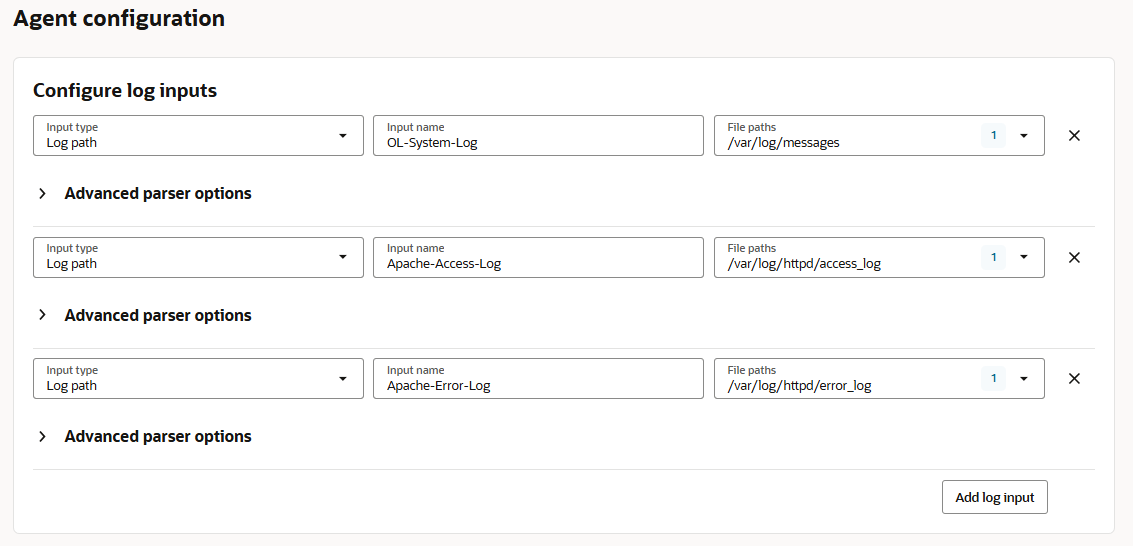 - Agent configuration のConfigure log inputs を指定します。