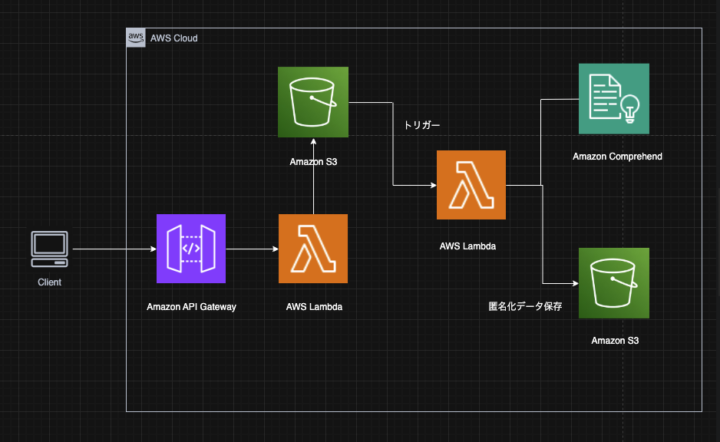 ユーザーがテキストデータを保存するとデータの中に個人情報(名前や電話番号)などが含まれていないか分析します。含まれている場合は匿名化して別のS3にも保存されます。