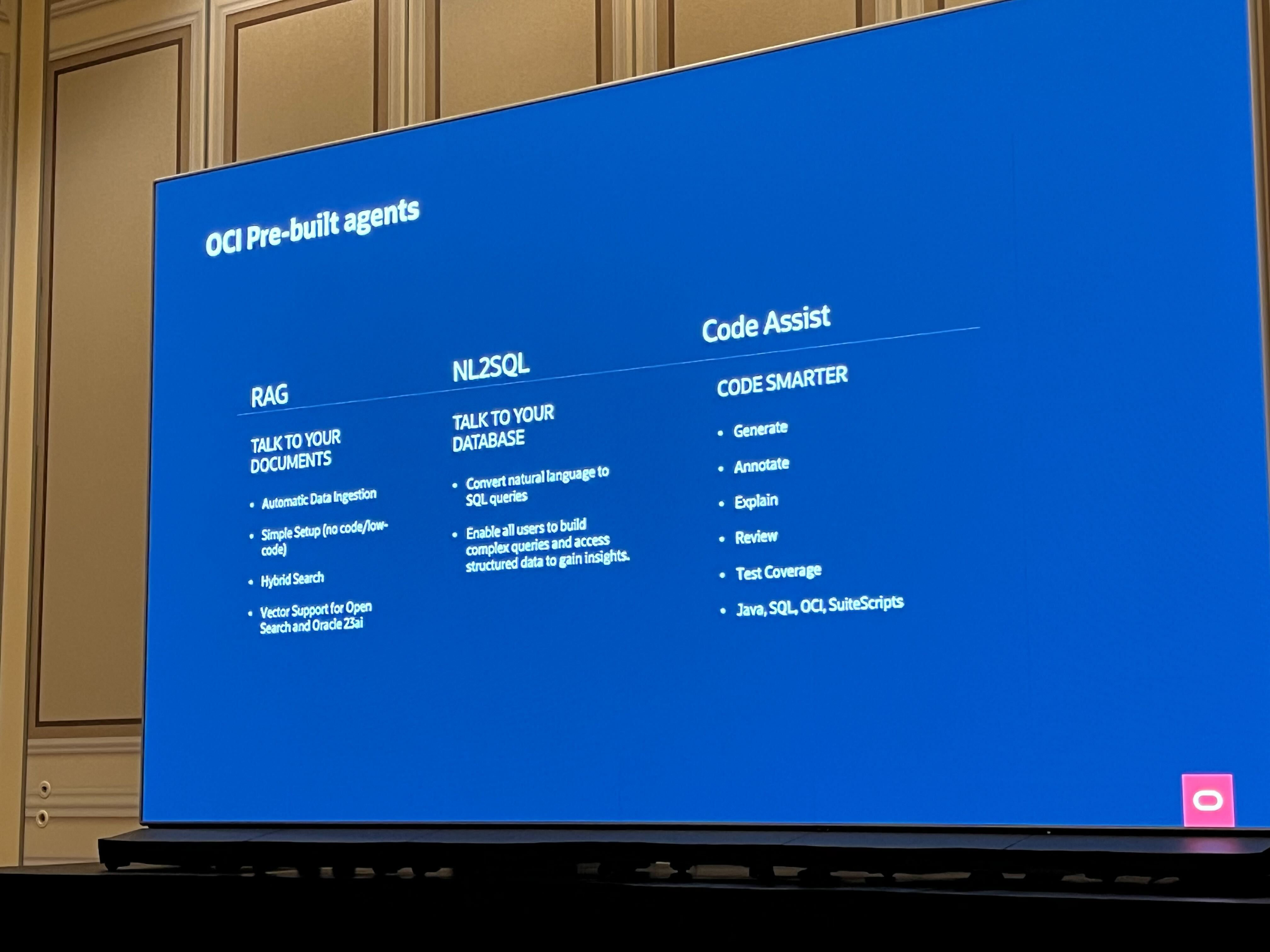 ここではOCIが提供するエージェント数種の概要とそれらのエージェント開発をサポートする新機能について説明がありました。