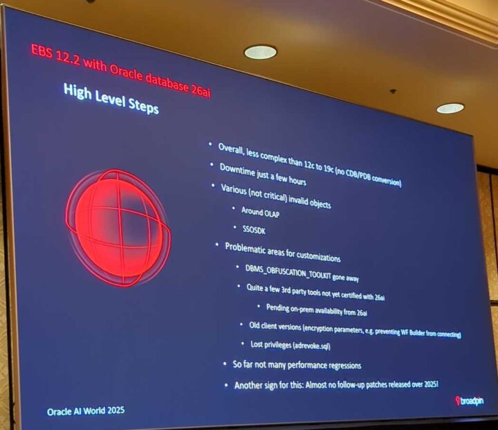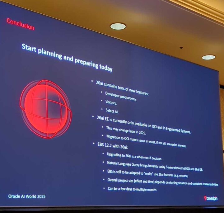 Join us for an in-depth exploration of upgrading the database of an E-Business Suite environment to 23ai. Gain exclusive insights from successful customer upgrades, focusing on compatibility, performance, and AI-supported functions. Learn proven strategies for a seamless migration. Supported with EBS 12.2.7+ since January 2025, Database 23ai is available in Oracle Cloud Infrastructure (OCI) and on engineered systems. We’ll cover the most relevant 23ai features and especially their significance in an E-Business Suite context, highlighting how these innovations provide substantial business value for EBS customers. This session is essential for those looking to future-proof their Oracle EBS environment.E-Business Suite