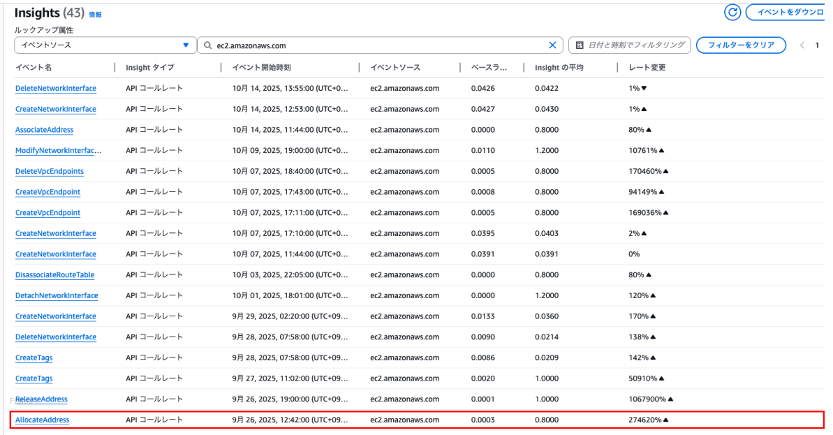 注目すべきは「レート変更」の列です。例えばAllocateAddressという操作は、普段に比べて2,746,200%という頻度で実行されていることが検知されています。