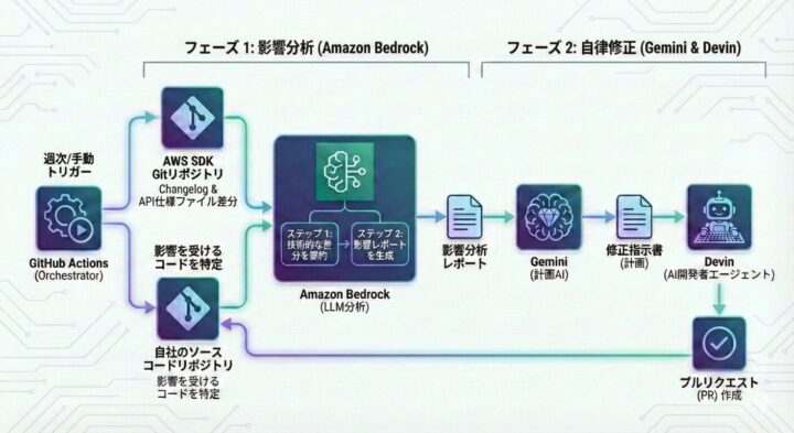 - 影響分析フェーズ (by Bedrock): まず、今回構築したパイプラインがGitHub Actionsを起点にAWS SDKの変更を検知し、Amazon Bedrock上のLLMを使って影響分析レポートを生成します。