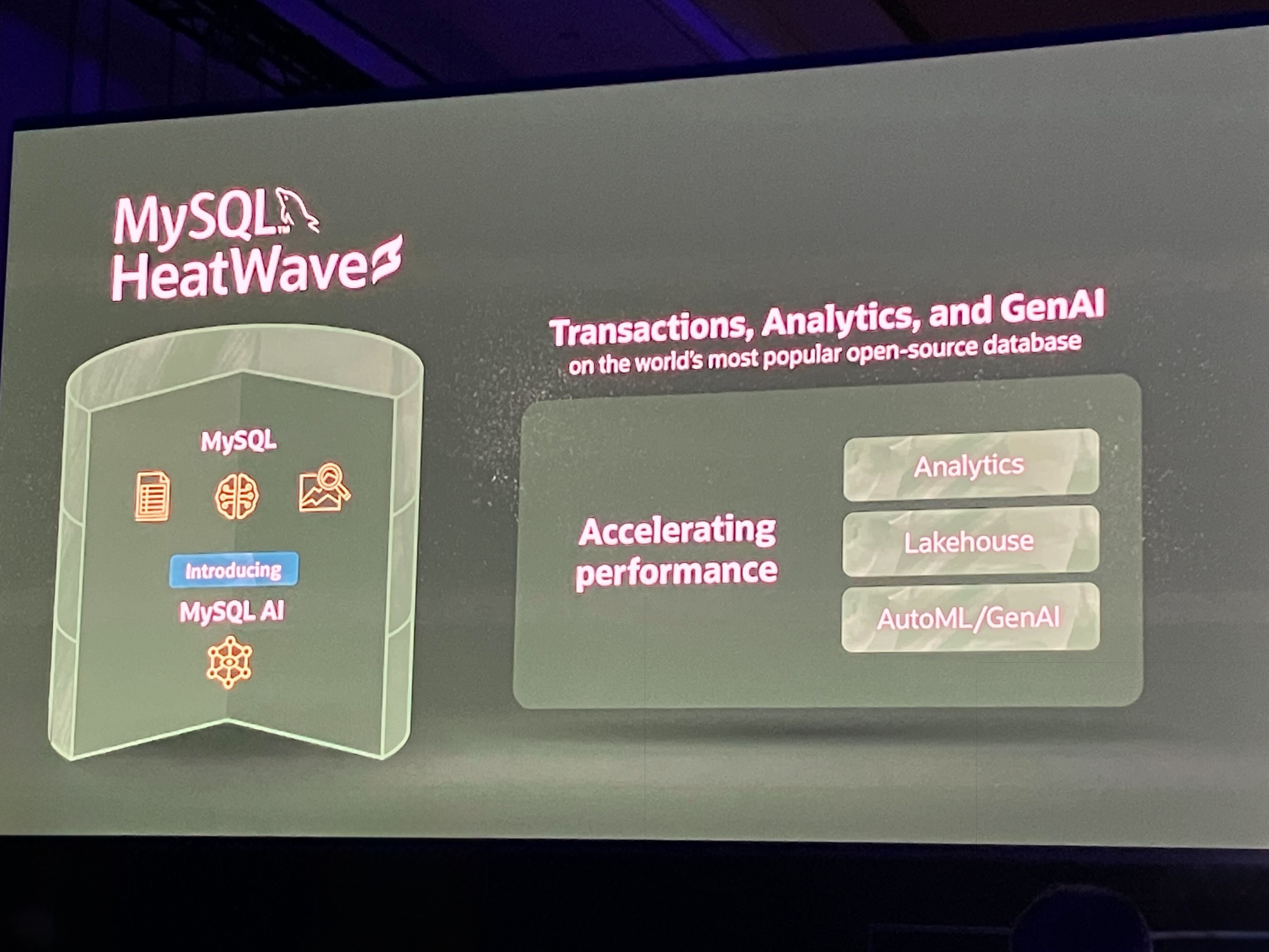 セッション中盤では、MySQL HeatWave担当SVPのNipun Agarwal氏が、マルチクラウド環境で進化するデータベース技術をデモンストレーションしました。AWS上で稼働するMySQL HeatWaveが、Amazon S3上のデータを移動させることなく直接、高速に分析する様子や、自然言語でデータベースと対話する様子が実演され、技術的な選択肢の広がりを示しました。