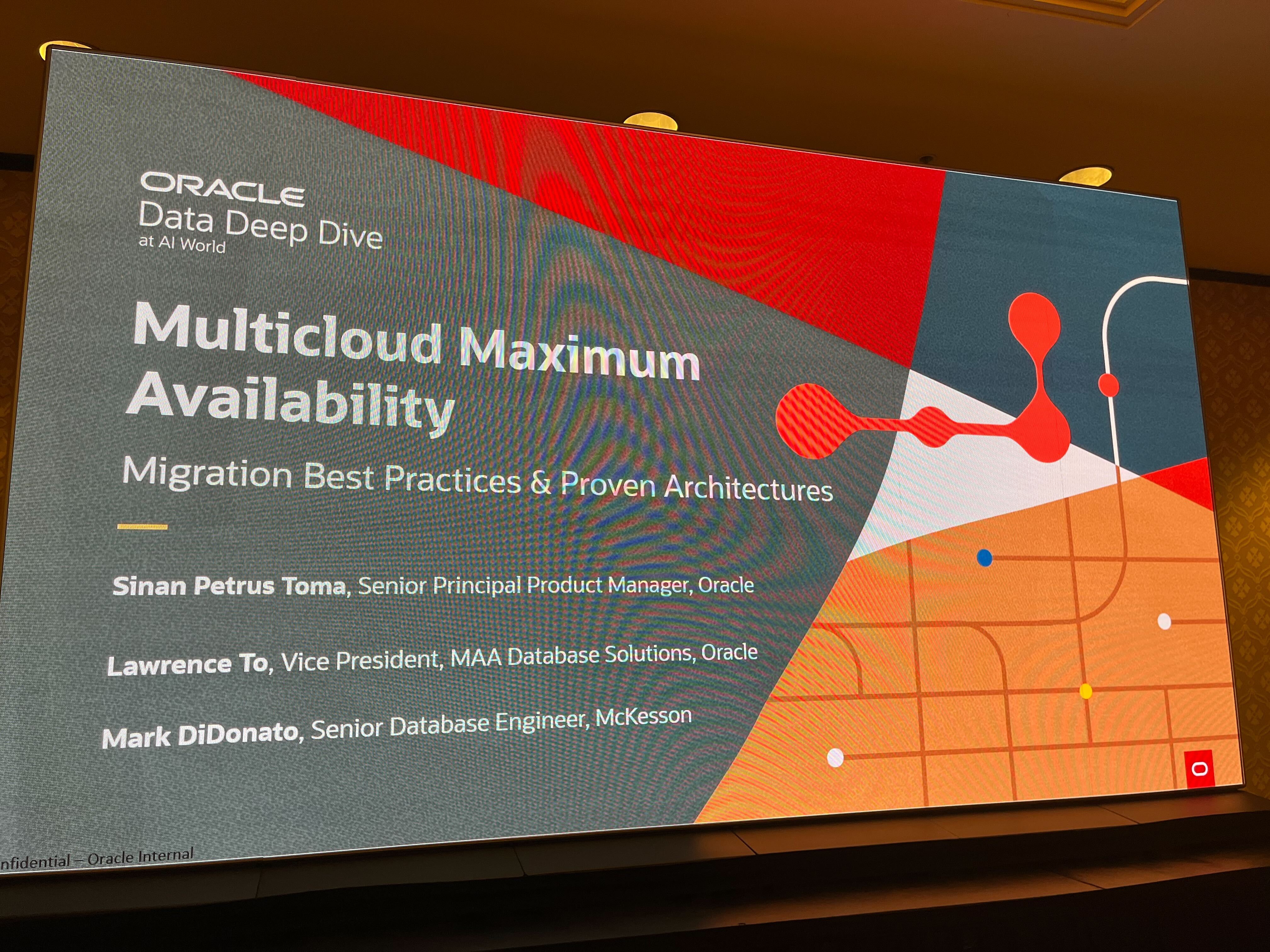 本セッションにはOracle社のシニアプリンシパルプロダクトマネージャーであるSinan Petrus Toma氏、同社のMAAデータベースソリューションズチームでVice President(日本でいう事業本部長的ポジションのようです)を務めるLawrence To氏に加え、実際に大規模な移行を進行中の顧客であるMcKesson社のシニアDBエンジニア、Mark Didonato氏の3名が登壇しました。