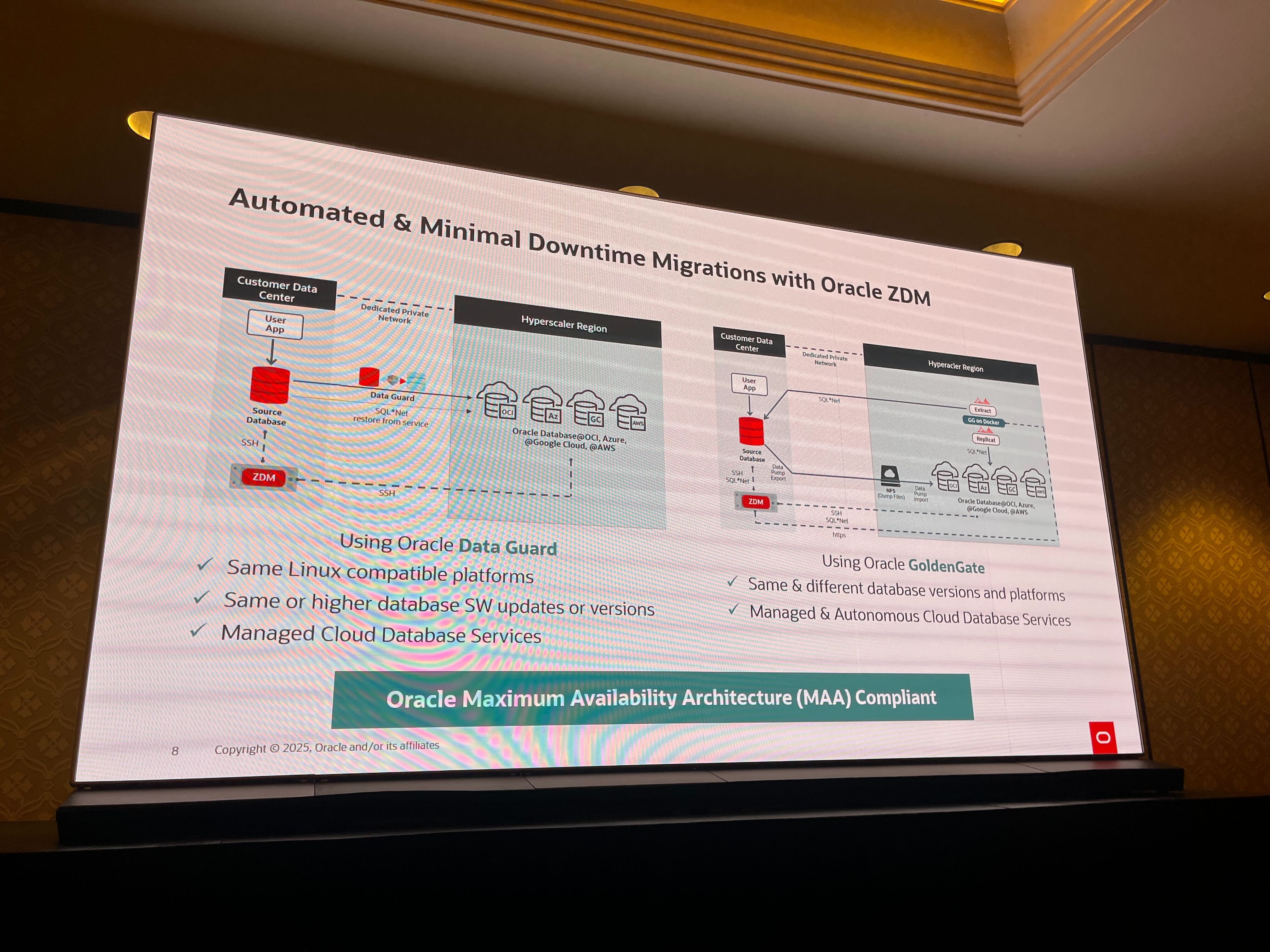 セッションではOracle Database@Hyperscaler運用によるメリットと併せて最小限のダウンタイムでの移行を実現するZDMの概要や、移行後の高可用性を確立するためのMAAのベストプラクティス等について語られました。