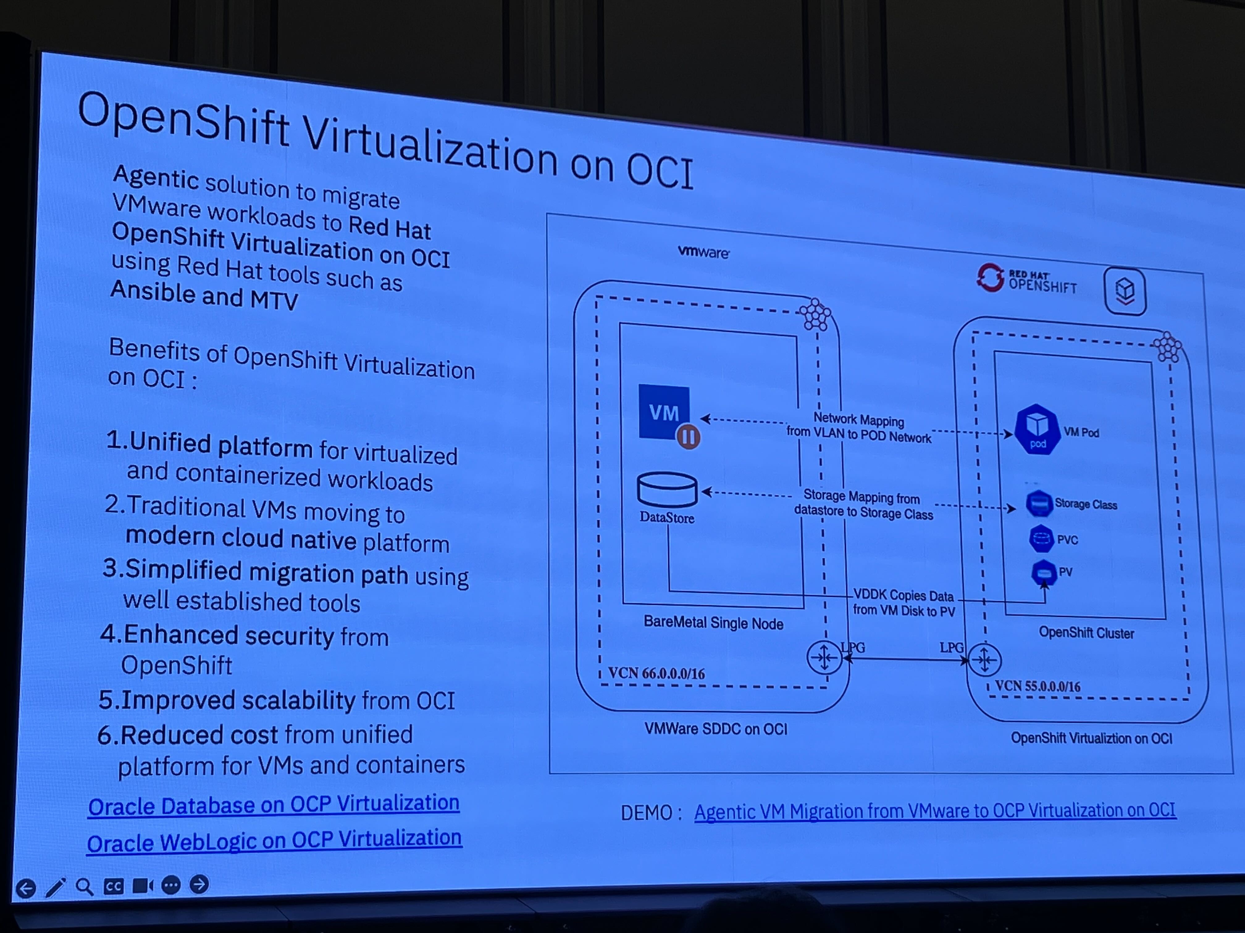 - VMwareワークロードのモダナイゼーション:近年、コストの問題が浮上しているVMware環境から、OpenShift Virtualization on OCIへワークロードを移行するソリューションです。これにより、コストを最適化しつつ、VMとコンテナを同じ基盤で管理し、クラウドネイティブな開発への道筋をつけることができます。