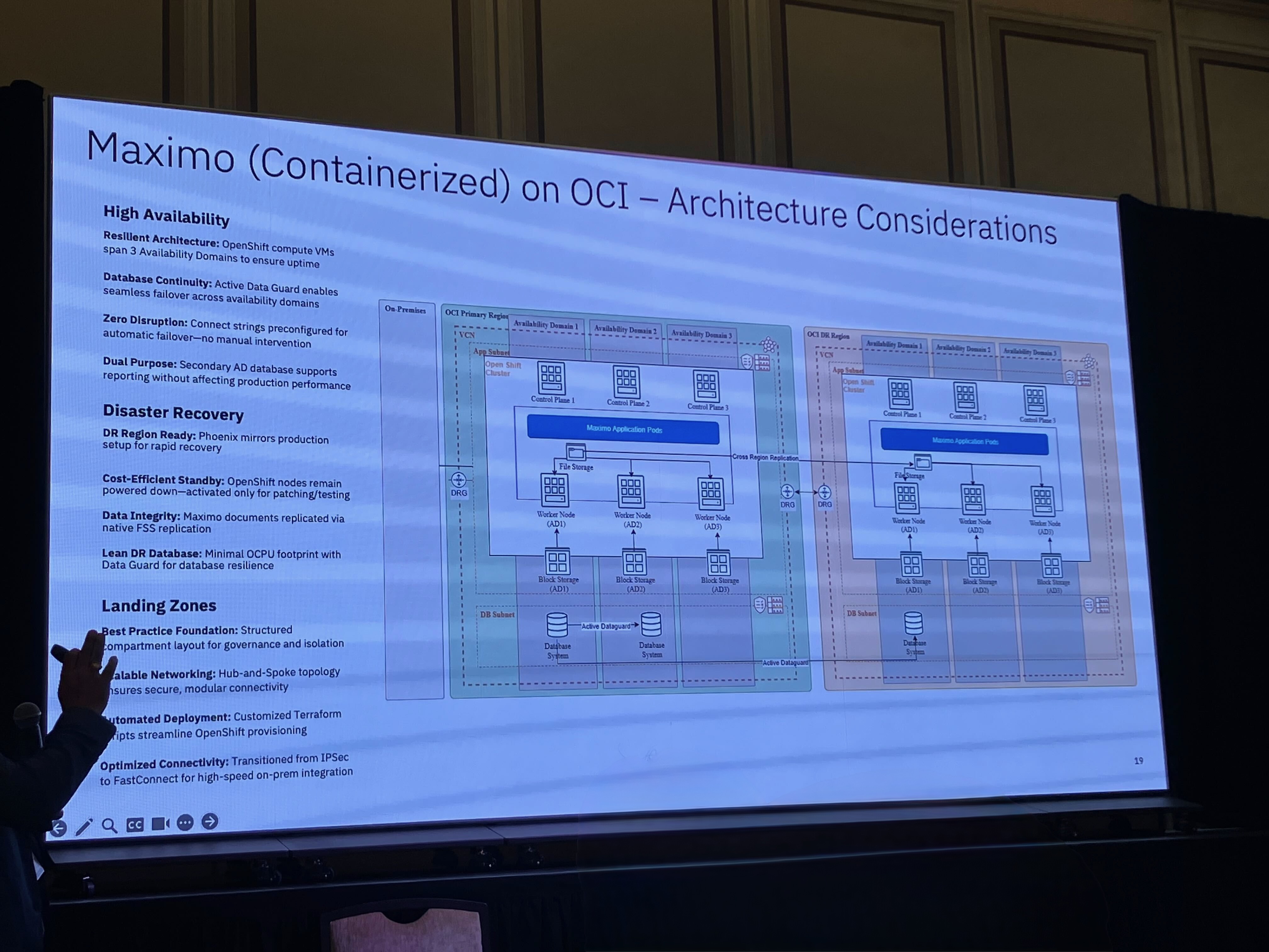 - MaximoアプリケーションのOCI移行事例:企業の資産管理システム「IBM Maximo」を、旧バージョンからコンテナ化された最新バージョンへアップグレードすると同時に、OCI上のOpenShiftへ移行した事例です。このプロジェクトでは、Ashburn(米国東海岸)とPhoenix(米国西海岸)のリージョンをまたいで災害対策(DR)構成を組むことで、極めて高い可用性と事業継続性を実現しています。