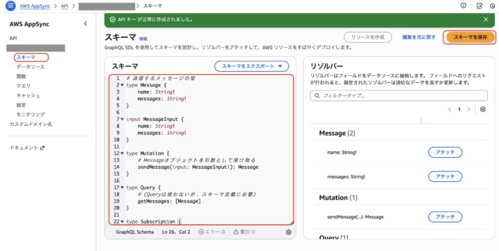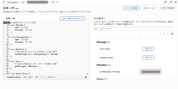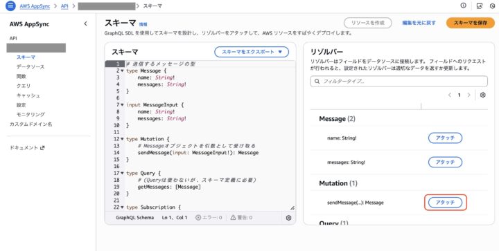 右側の「リゾルバー」一覧から、MutationセクションにあるsendMessage(…)の横の「アタッチ」ボタンをクリックします。