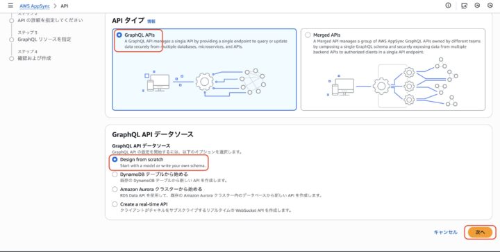 APIタイプが「GraphQL API」であることを確認し、データソースとして「Design from scratch」を選択します。「次へ」をクリックします。
