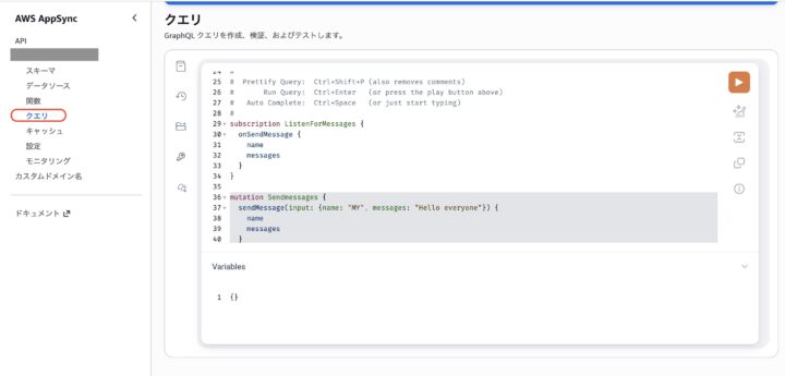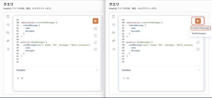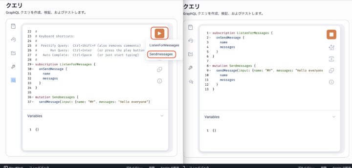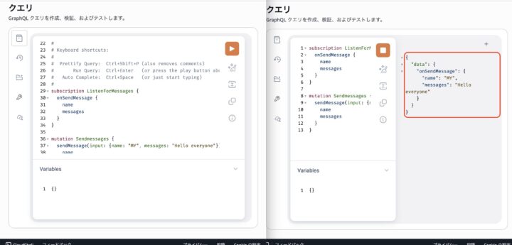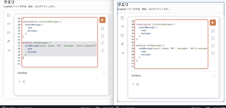 AppSyncの「クエリ」エディタは、Mutation(送信)とSubscription(待機)を同時にテストできます。この機能を使って、リアルタイムでメッセージが届くか試してみましょう。