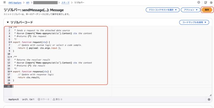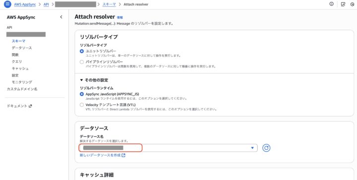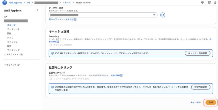 リゾルバーランタイムはデフォルトの「AppSync JavaScript (APPSYNC_JS)」のままでOKです。下にスクロールして「作成」ボタン(または「リゾルバーを作成」)をクリックします。