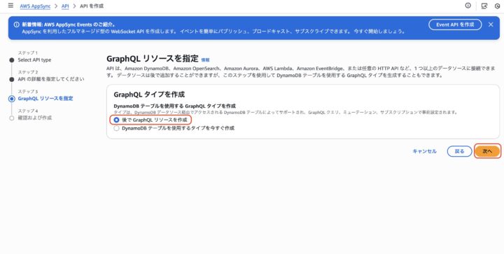 「後でGraphQLリソースを作成」を選択し、「次へ」をクリックします。