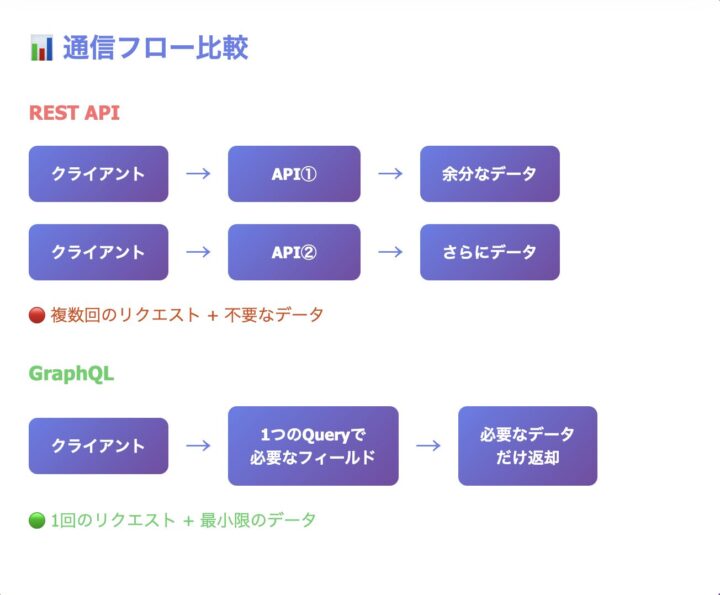 GraphQLは、この柔軟なデータ取得を統一された仕組みとして実現できる点が大きな特徴です!