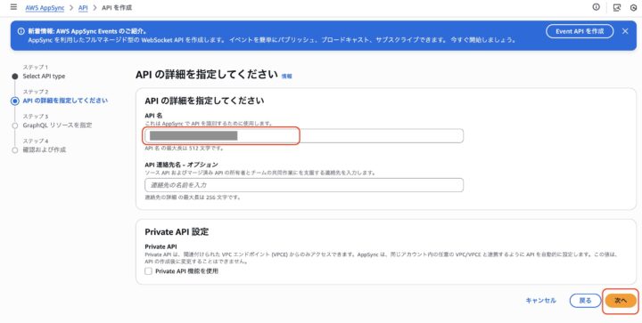 AWS AppSyncのコンソールを開き、「APIを作成」をクリックします。「Event API または GraphQL API を作成」画面が表示されるので「GraphQL API」を選択します。