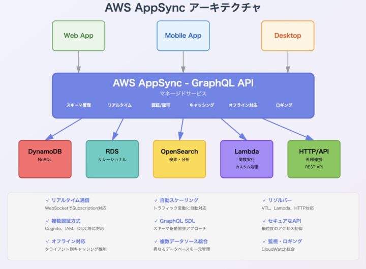 AppSyncは、単にGraphQL APIの窓口を作るだけでなく、データベースへの接続、リアルタイム通信、オフライン対応、セキュリティ設定など、現代のアプリケーション開発に必要なバックエンド機能を包括的に提供します。