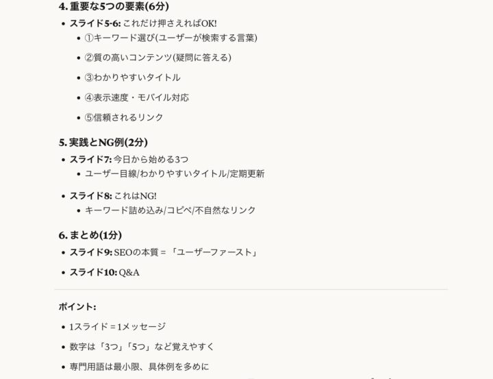 「SEO とは何かがわからない方向けに SEO 講座を行なうのですが、スライドの目次と構成案を考えてほしいです。発表時間は15分です。」