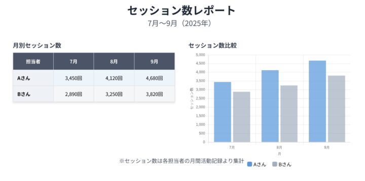 例えば、とあるブログにおいて、A さん・B さんという執筆者がいたとします。そこで、それぞれが執筆した記事の3ヶ月分のセッション数をデータとしてまとめ、表を作りたいとなった場合、以下の画像のように提案してみると