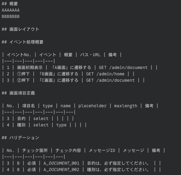 データベースのテーブル定義書をマークダウン化し、AIにコードを生成させたい場合のプロンプトです。