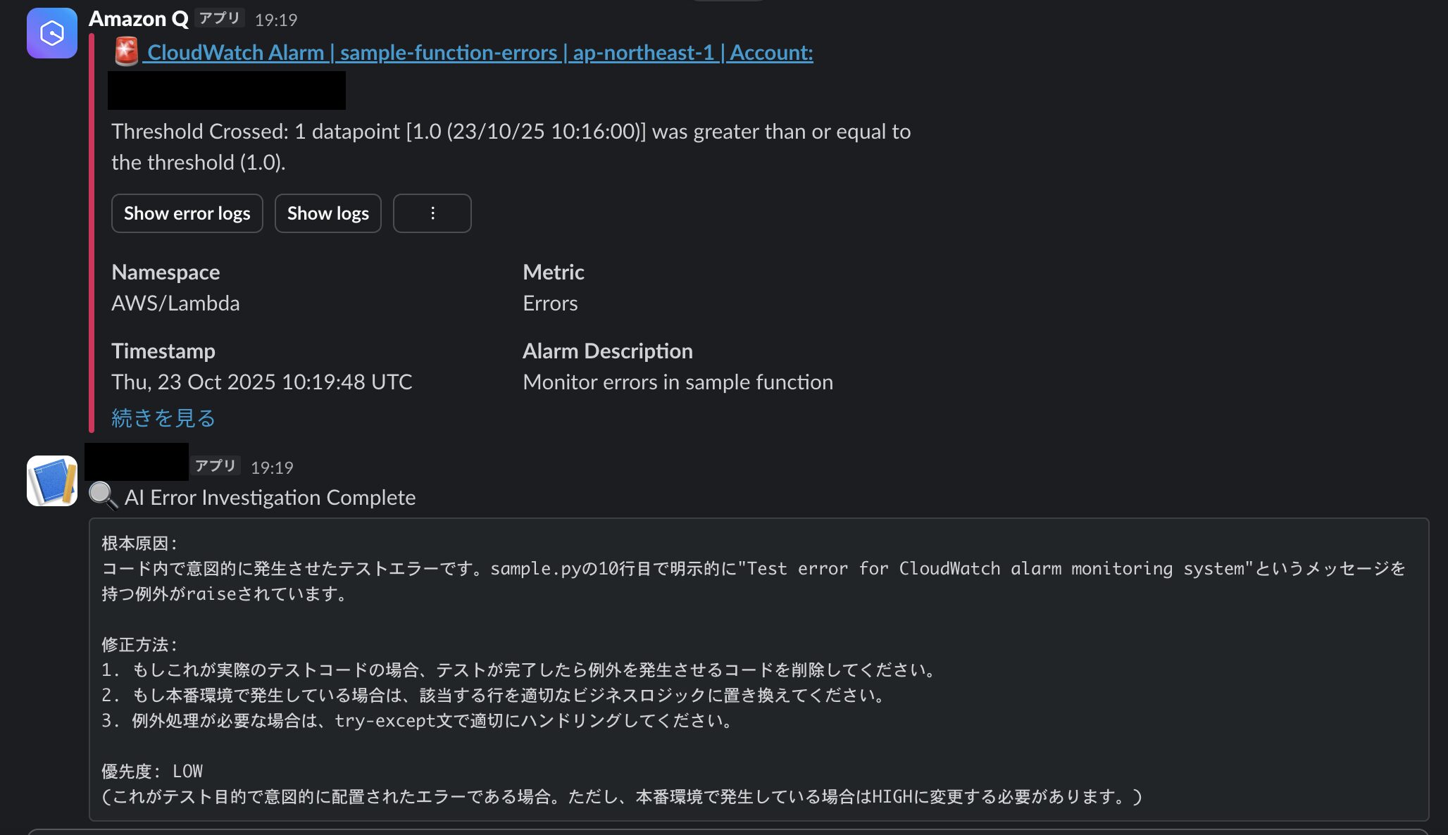 - エラーログ調査用LambdaでBedrockを呼び出し、Lambda(sample-app)のCloudWatch Logsを調査した結果をSlackへ通知