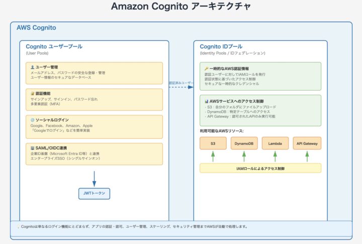 Cognitoは、大きく分けて「ユーザープール」と「IDプール(IDフェデレーション)」という2つの主要機能で構成されています!