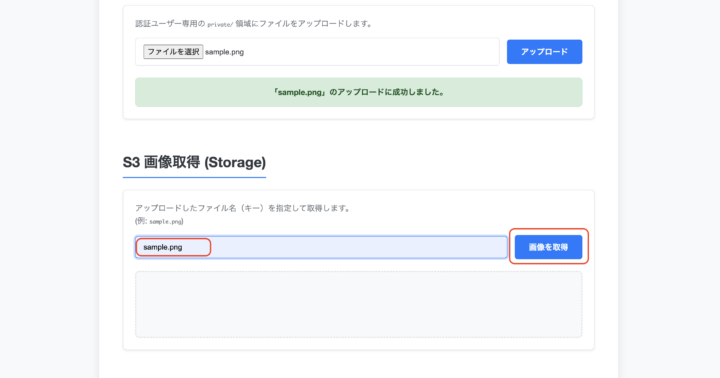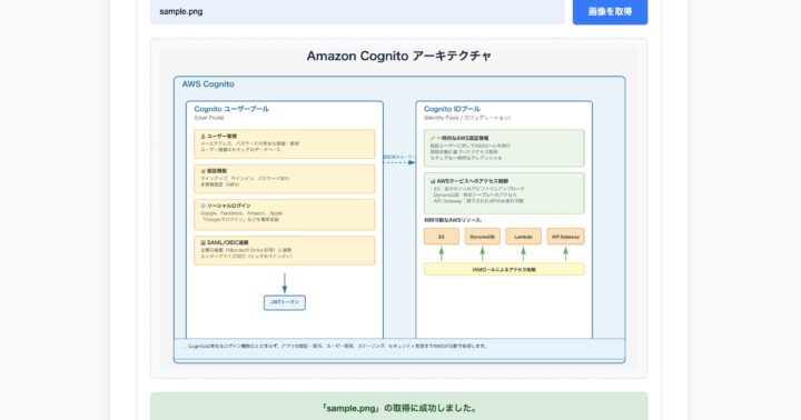 次に、「S3 画像取得」セクションのテキストボックスに、先ほどアップロードしたファイル名(sample.png)を入力し、「画像を取得」ボタンをクリックします。