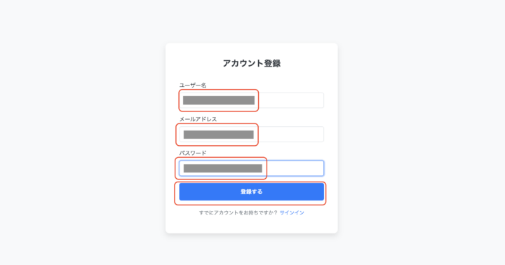 任意の「ユーザー名」「メールアドレス」「パスワード」を入力し、「登録する」ボタンをクリックします。