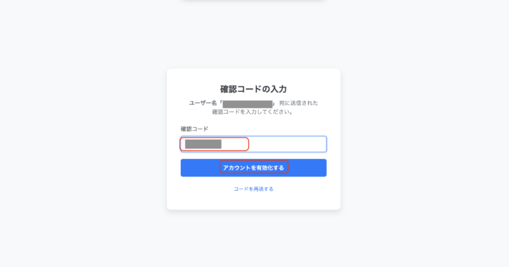 確認コードの入力ページ(confirm.html)に移動します。登録したメールアドレスに6桁の確認コードが届いていることを確認し、入力して「アカウントを有効化する」ボタンをクリックします。