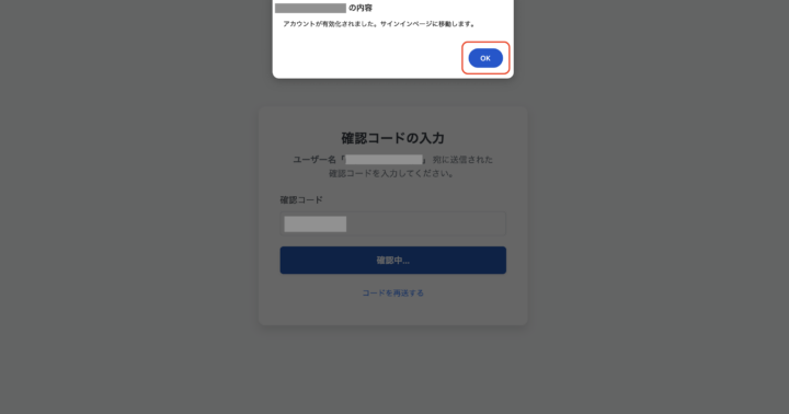 「アカウントが有効化されました」というアラートが表示されたら「OK」をクリックします。