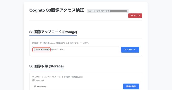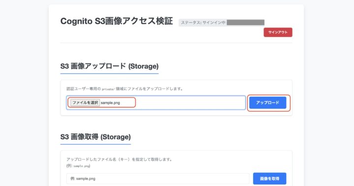 「S3 画像アップロード」セクションで、「ファイルを選択」ボタンから任意の画像ファイル(例:sample.png)を選択し、「アップロード」ボタンをクリックします。