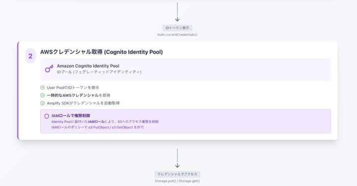 - AWSサービスへのアクセス制御: 「ログインしたユーザーだけが、S3の自分のフォルダにファイルをアップロードできる」「API Gatewayの特定のAPIを実行できる」といった、AWSリソースへのきめ細かなアクセス制御を実現します。