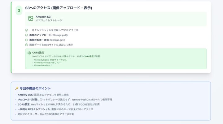 さらに、IDプールとIAMロール、S3(今回はIAMポリシーで設定)を組み合わせることで、認証されたユーザー単位でAWSリソースへのアクセスをセキュアに制御できる柔軟性も大きな特徴です!