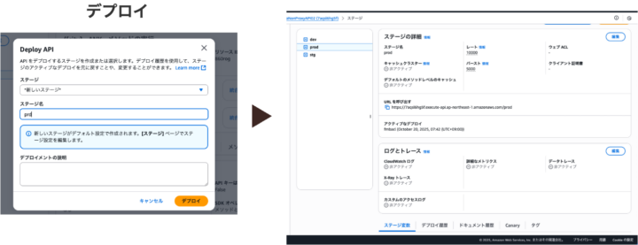 ステージとはクライアントがデプロイされたREST APIのバージョンの識別子です。ステージを作成後、実際にユーザーがアクセスできるURL(APIエンドポイント)が発行されます。つまり、そのURLにリクエストメッセージを送信することで、目的の処理を API にリクエストすることができます。ステージ名は発行されるURLの一番右側に表示されます。