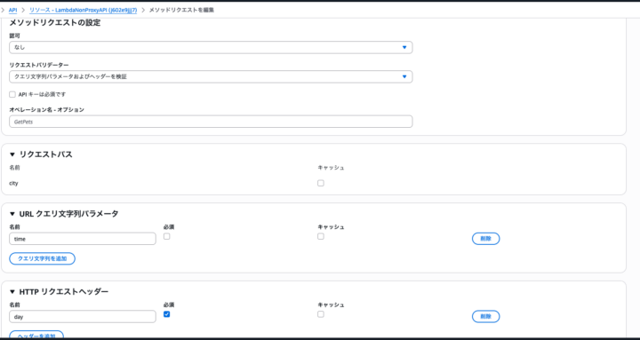 また、クエリ文字列とヘッダーには必須というオプションがありますが、これは「クライアントがそのパラメーターを含むことを強制するか否かを設定するもの」です。ちなみに、URLのパスの一部として配置されるパスパラメーターはこの場面では設定できません。そもそも、パスパラメーターは画像にあるようにリソース作成時に設定しており、設定した場合、リクエストに含めることは必須です。