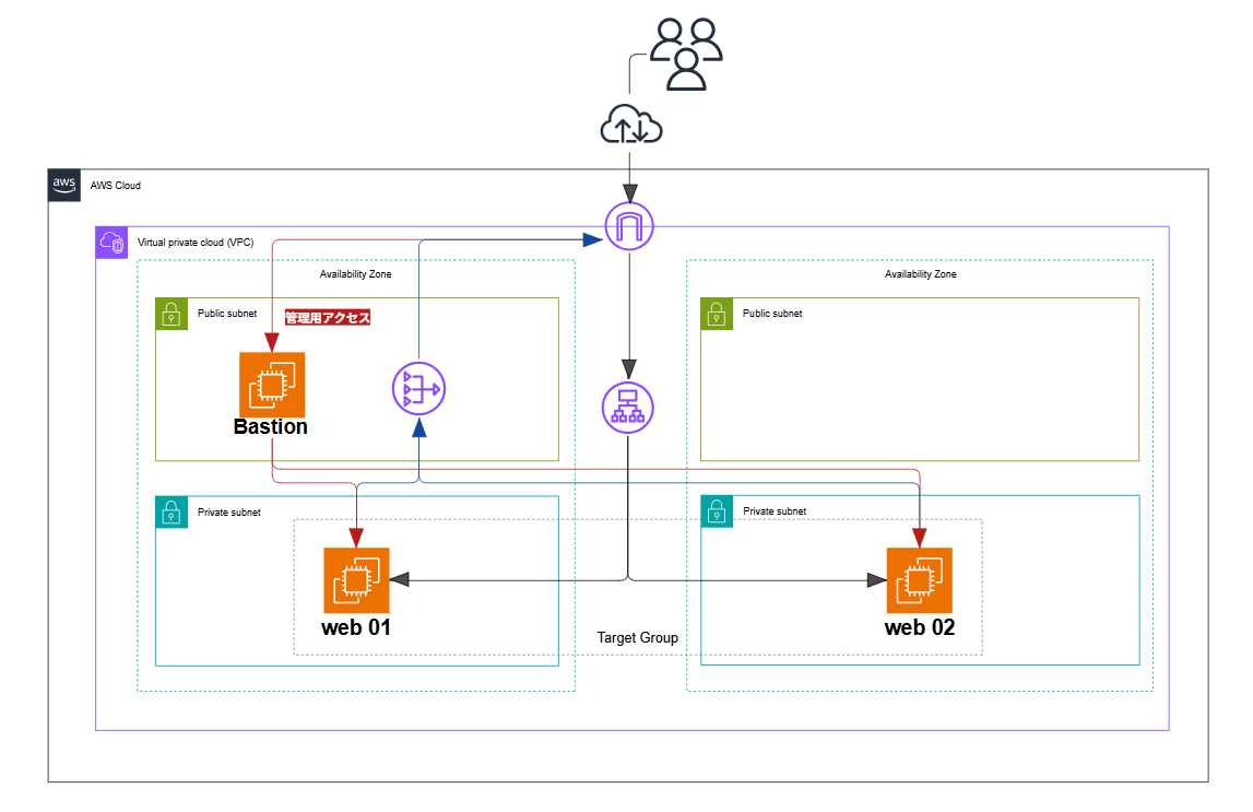 接続されるEC2インスタンスの違いがわかりやすくなるように構成図内の左のインスタンスを「web01」、右のインスタンスを「web02」とします。