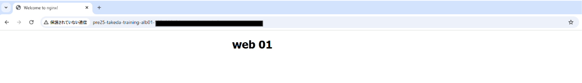 まずはweb01のインスタンスに接続します。するとEC2インスタンスにインストールしたnginxの画面が現れました。(分かりやすいようテキストを編集しています)