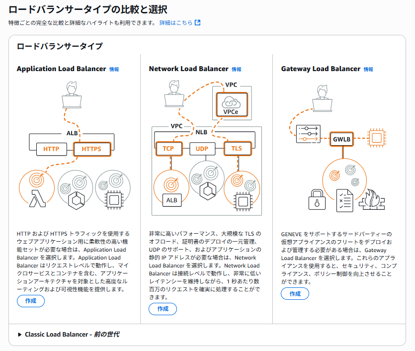 (Classic Load Balancerも選択可能ですが、CLBは現在EC2-Classicを利用している場合向けのリソースとなっており、新規での作成は非推奨となっています)