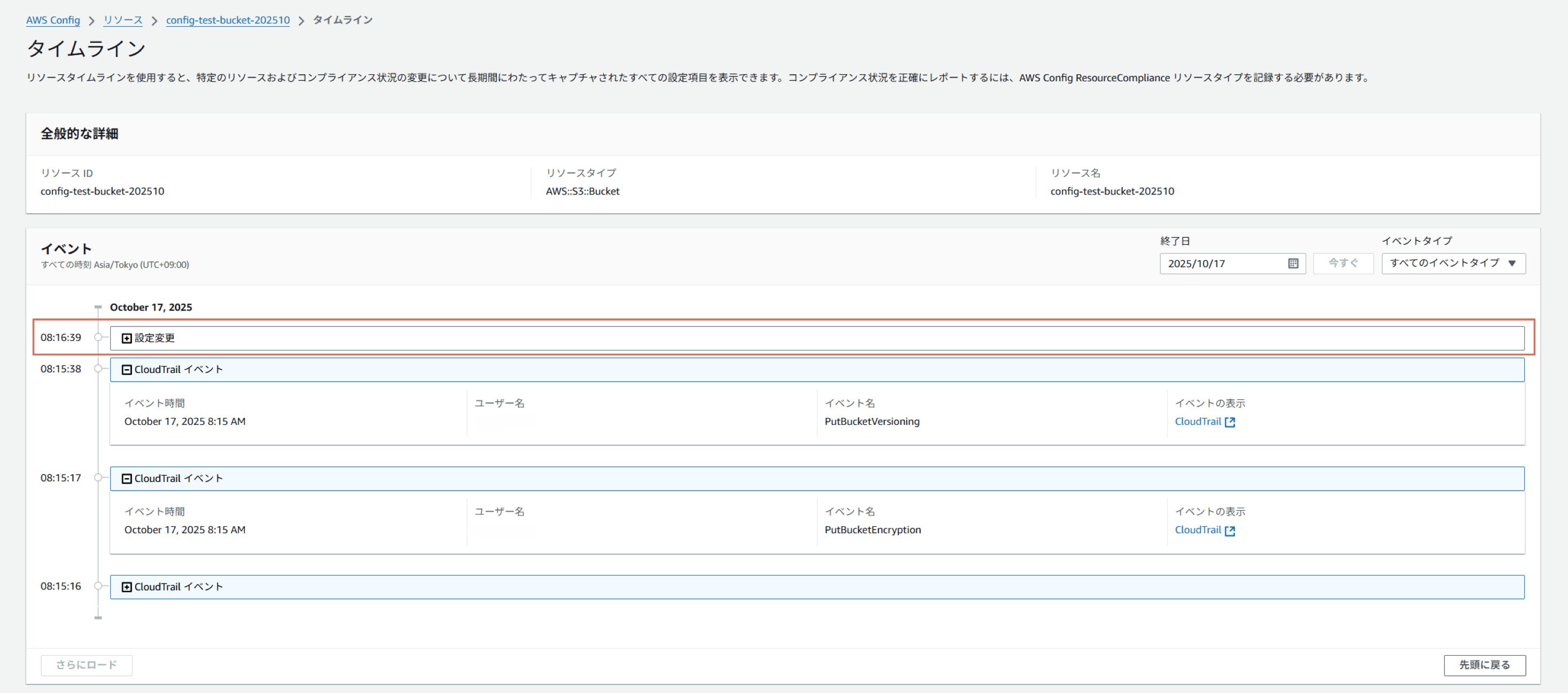 次のようにS3バケットの設定を変更した履歴が、日時と共に記録されており、それらを時系列で確認することができます。