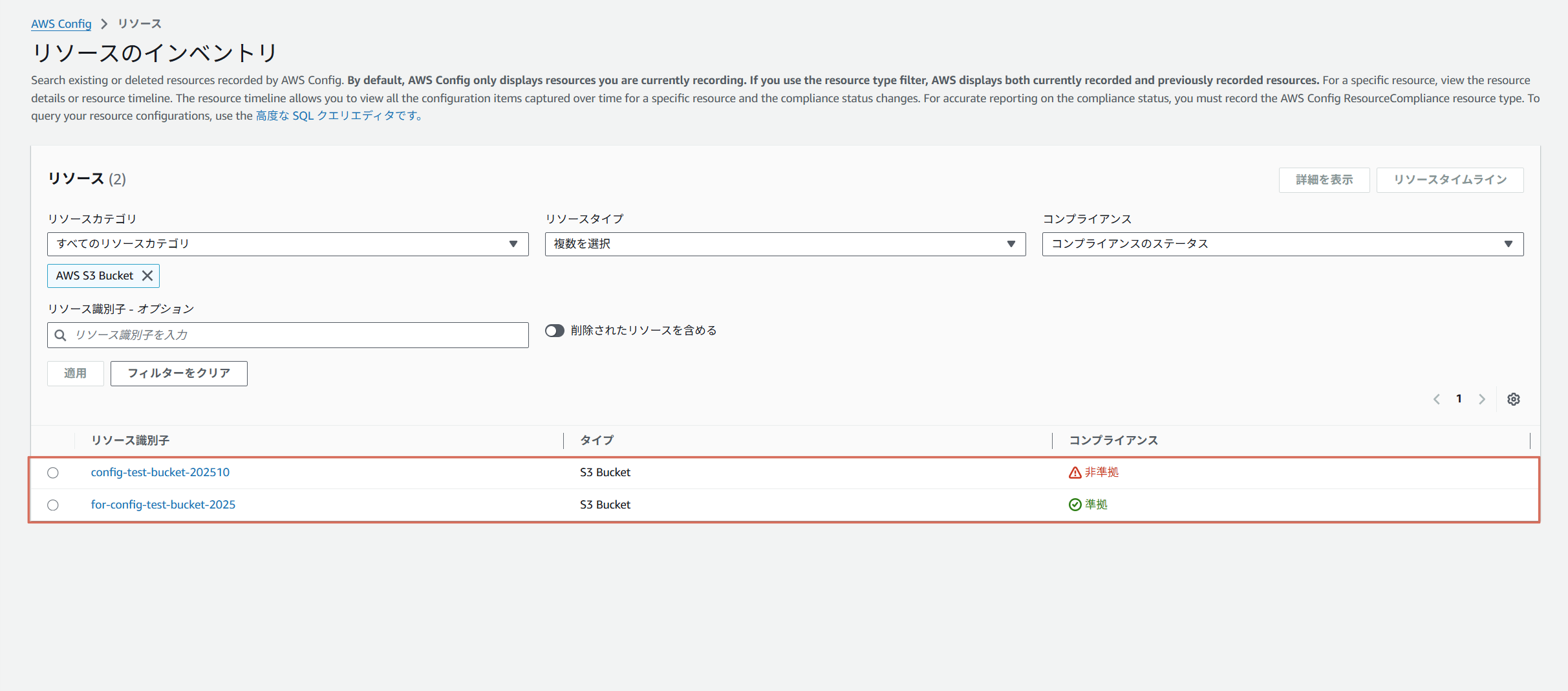 次のように監視対象のS3バケットである「config-test-bucket-202510」では、パブリックブロックアクセスの設定やバケットポリシーによって公開読み取りを許可した状態のため「非準拠」と検出されます。