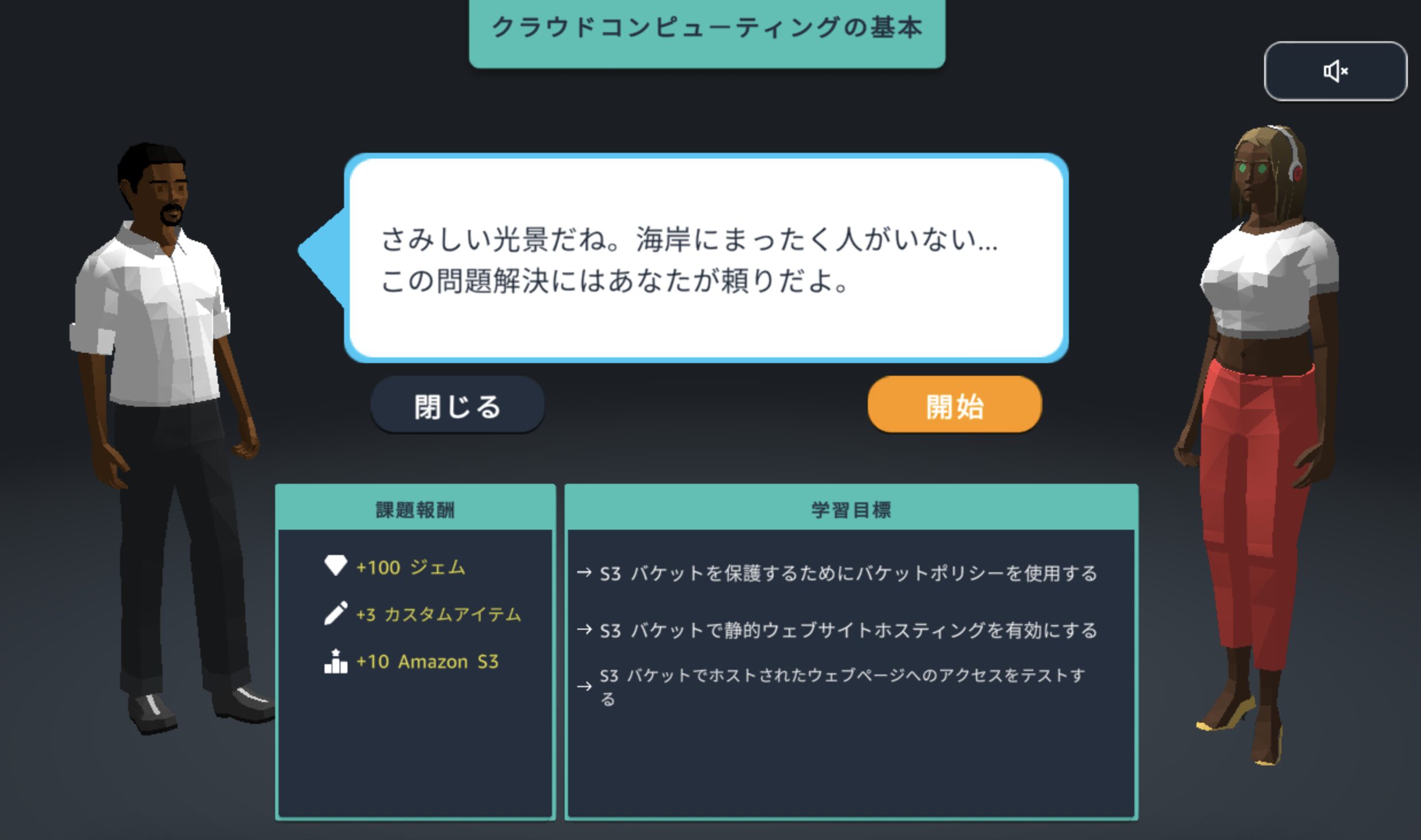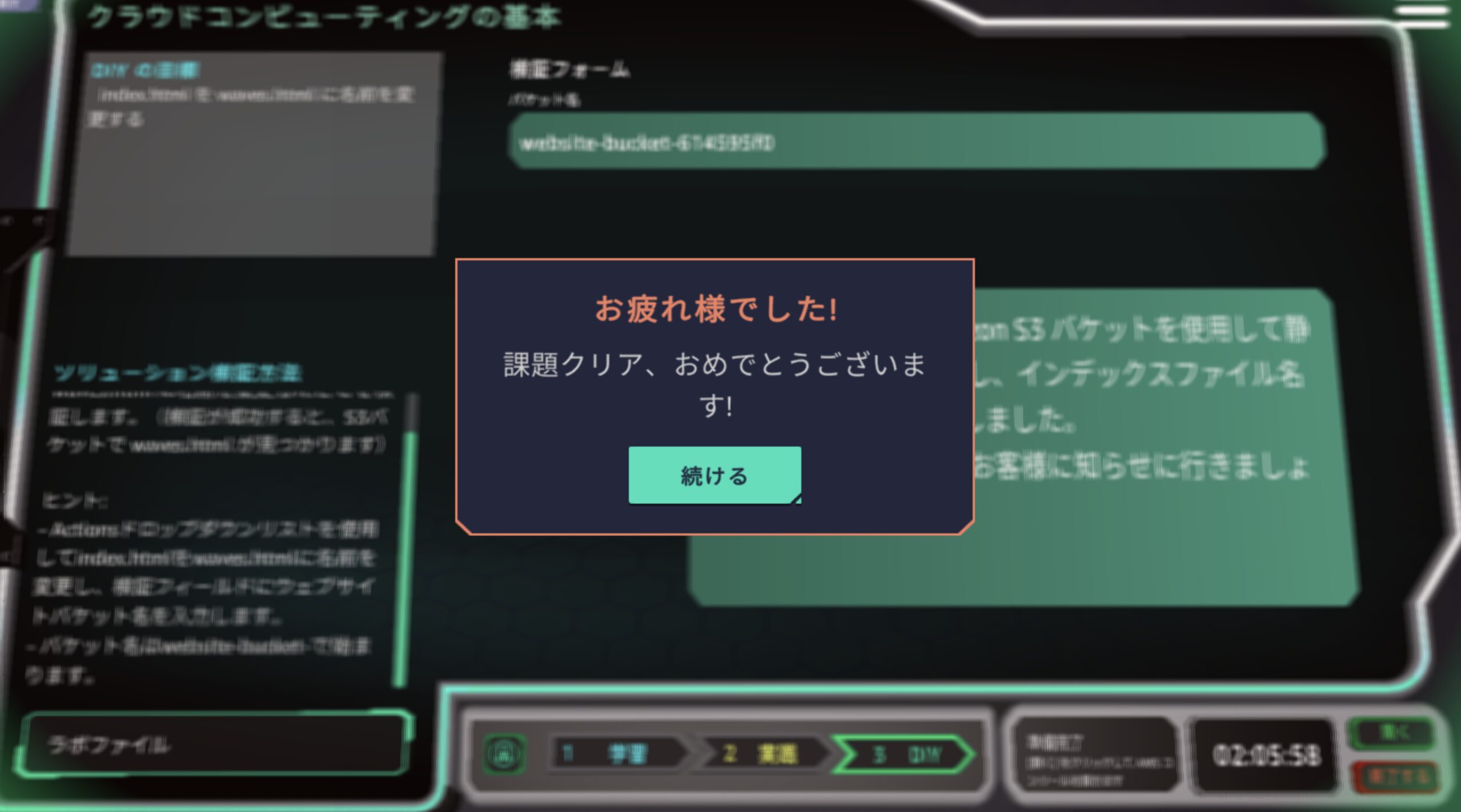 ゲーム内で、ストーリーに沿って出題される課題を、実際のAWSのアカウントを使用しながら解くコンテンツです。