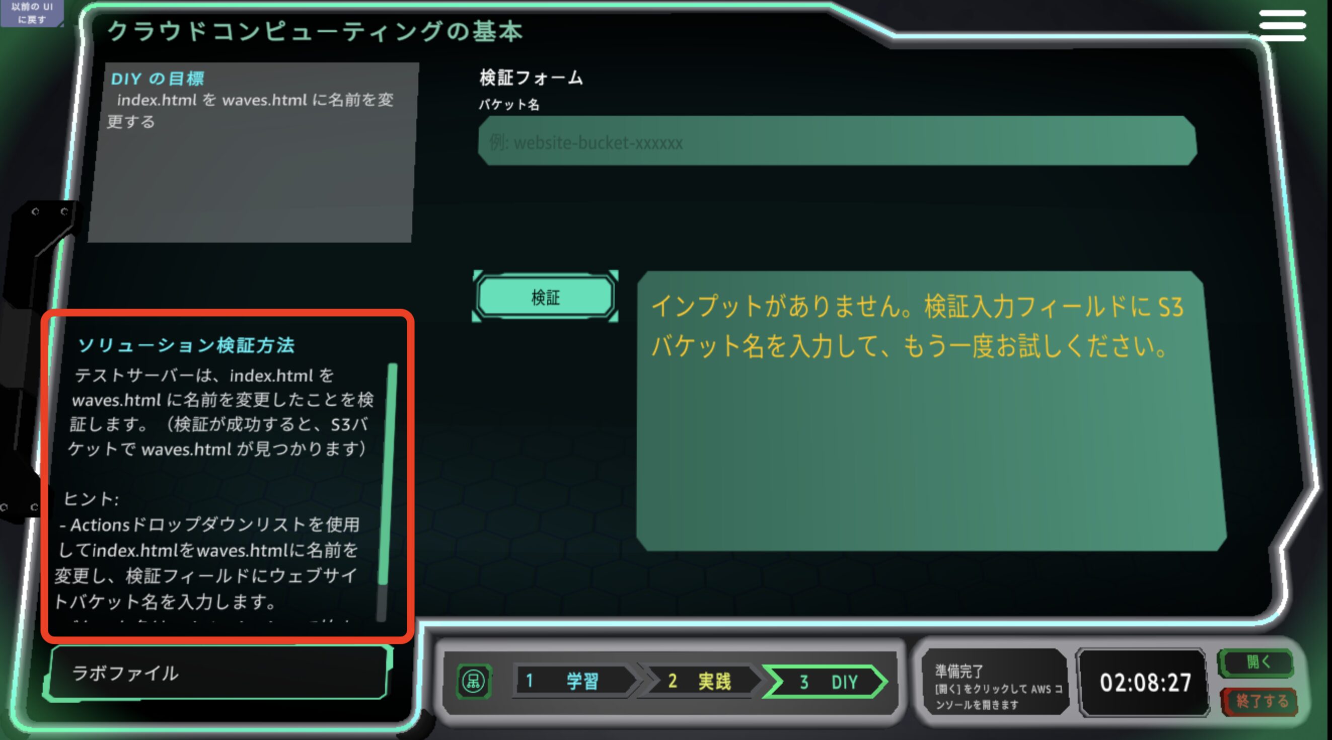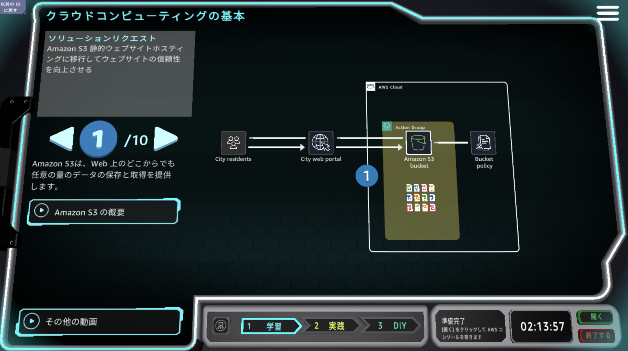 学習→実践→DIYのステップで体系的に学ぶことができ、ゲーム内で用意されたAWSアカウントのコンソールを操作することができます。